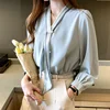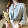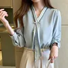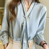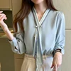 Korean Women Blouses Women Striped Blouse Shirts Woman V Neck Print Blouse Tops Plus Size Autumn Woman Bow Beading Blouses Shirt