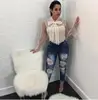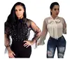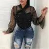 Women lace blouse pearl Beading summer sexy women top Mesh bow bandage flare long sleeve Elegant famale Shirts plus size