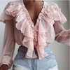 Women Solid Color Deep V-Neck Ruffle Long Sleeve Blouse Ladies Sexy Tops Blouse