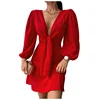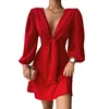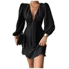Women Sexy Deep V-Neck Mini Dress Lantern Sleeve Pure Colour Party A-line Dress 2021 Autumn New Office Lady Vintage Dress