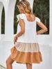 SRUBY Ruffle Trim Colorblock Smock Dress Female Maxi Dress Beach Holiday Robe Dress Bohemian Long Lace Up Belted Vestidos