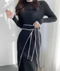 Ladies Dress with Belt Retro Stitching Thin Knit Mid-length Dress Ladies Spring Winter Elegant Sweater Knitted Dress Vestidos