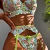 Women's embroidery extoic jumpsuit floral see-through g-sting net yarn underwear gathered three-piece suit garter belt lingerie
