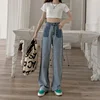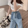 Women's Jeans Korean Pants Buckle Contrast Color Stitching High Waist Slimming Jeans Casual Loose Women's Pants Straight Style