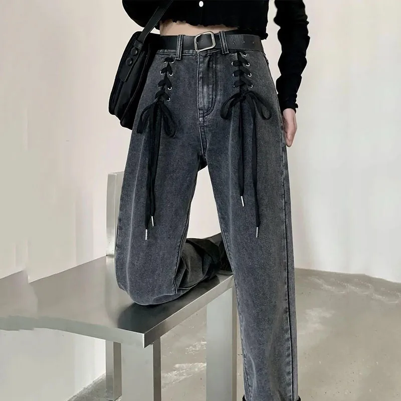 Jeans Women High-waist Lace-up Zipper Pockets Vintage Straight Pants Student Daily Elegant New Loose Wide Leg Trousers Lady HOT