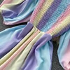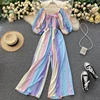 Vacation style jumpsuit autumn new women's design tie dye gradient rainbow color sweet puff sleeve elastic waist wide leg romper