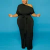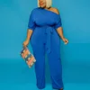 Plus Size Blue Jumpsuits and Rompers For Women 4xl 5xl High Waist Half Sleeve Skew Collar Solid Femme Jumpsuits Big Size 2020