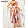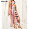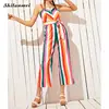 Women Summer Rompers Wide Leg Long Overalls Colorful Striped Jumpsuits Beach Style Lace Up Sashes Rainbow Pants Fashion Jumpsuit