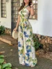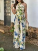 Women Fashion Summer V-Neck Sleeveless Crisscross Halter Tropical Print Jumpsuits Wide Leg Pants Tracksuit Overalls