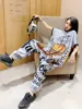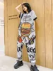 Tide brand summer large size personality cartoon printed rhinestone jumpsuit loose was thin short sleeve jumpsuit Harlan pants
