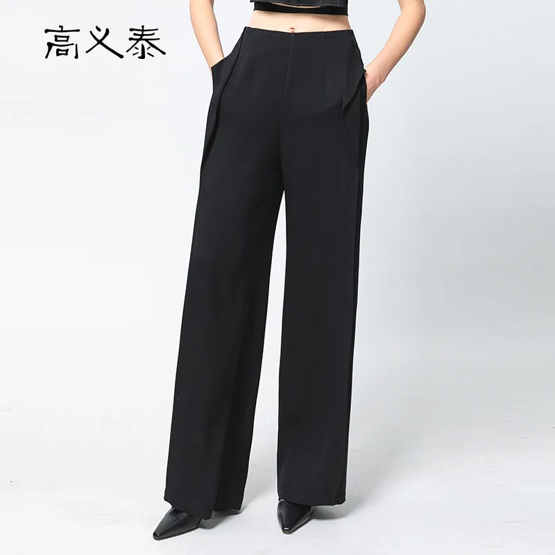 GAOYITAI Simple Ruffles Pockets Elastic Waist Black Silk Woman Pants Autumn Office Ladies Trousers Straight Pants Women KY018