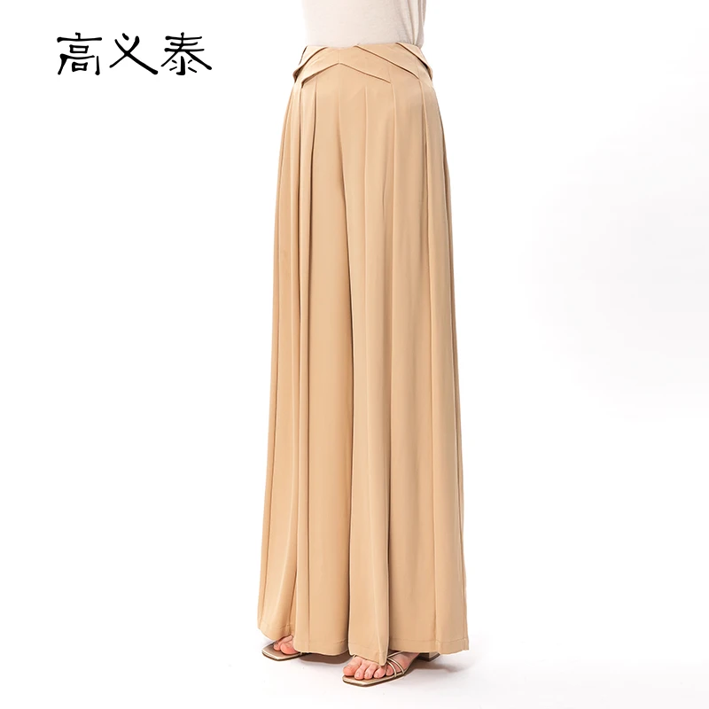 GAOYITAI Stylish Solid Silk Culottes Office Ladies Pleated Pantskirt Three-dimensional Decoration Wide Leg Pants Autumn KY011