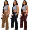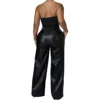 2022 Autumn Fashion Long Leather Pants Women Black PU Leather Pocket Design Wide Leg Pants Casual Elastic Waist One Piece S-2XL