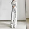 Women High Waist Cotton Solid White Pants Vintage Y2K Straight Leg Baggy Trousers Casual Slanted Button Hipster