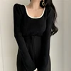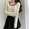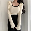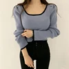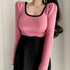 Patchwork Knitted Slim Sweaters Women Loose Puff Long Sleeve Retro Square Neck Women's Pullover Sweater Sweet Loungewear Base