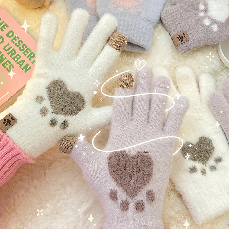 Winter Women Gloves Cute Cat Paw Warm Wool Touchscreen Gloves Women Fluff Fingerless Flip Gloves Outdoor Knitted Mittens Glove