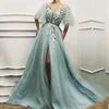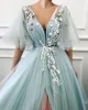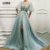 LORIE Light Green Fairy Prom Dresses Appliques 3D Flowers Short Sleeves Tulle Evening Gown Side Split Celebrity Party Dress