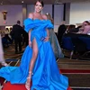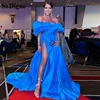 SoDigne Satin Side Split Evening Dresses Off the Shoulder Blue Women Special Occasion Gown A Line Long Cocktail Party Dress
