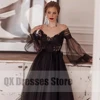 Simple Applique Off The Shoulder Homecoming Dress Tea Length Tulle Illusion Sleeve Party Gown With Full Women A-line Black Gown