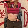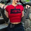ALLNeon Grunge Punk Streetwear Eye Graphic Red T-Shirts with Striped Sleeve Mall Goth Y2K O-neck Short Sleeve Baby Tees Harajuku