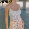 ALLNeon 90s Fashion Cute Backless Patchwork White Corset Tops Y2K Streetwear Spaghetti Strap Mesh Milk Maid Top Women Camis Sexy