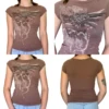 Women Clothing Polyester Casual Short T-shirts Adults Printed Rhinestone Short Sleeve Round Neck Pullover Tops