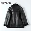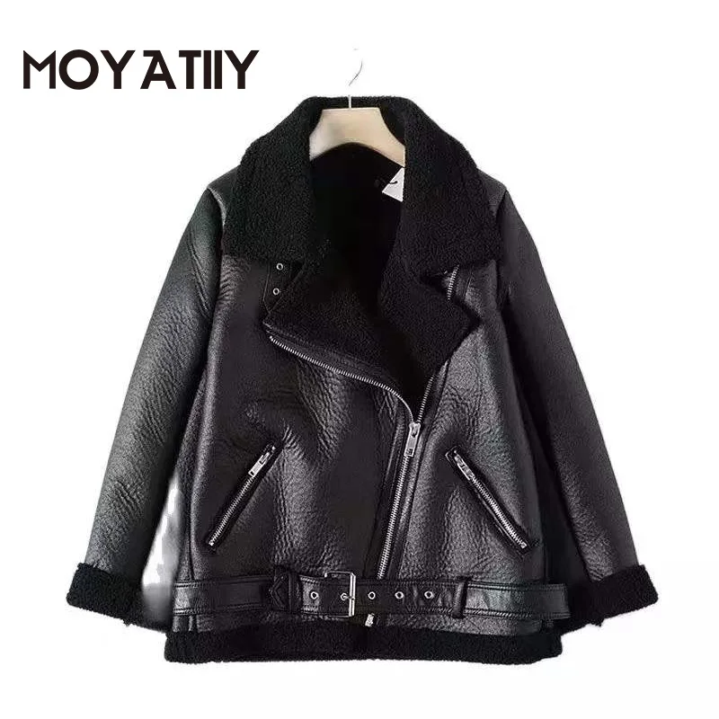 MOYATIIY Fashion Women Motorcycle Jacket Winter Thick Warm Leather Jackets Coats Creative Large Turn Collar Overcoats with Zip