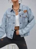 SRUBY Flap Pocket Patched Button Up Denim Jacket Women Jean Jacket Casual Slim Long Sleeve Denim Coat Plus Size Denim Jacket