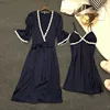 Women Robe Gown Sets 2 Pieces Spring Summer Silk Solid Color Nightdress Female Sleepwear Soft Homewear With Chest Pads
