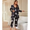 Pajamas women's sexy four piece suit silk thin nightdress women's long sleeve top pyjama femme hiver Night robes with straps