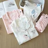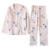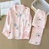Ladies Spring and Autumn Washed Crepe Long Sleeve Cotton Gauze Pajamas Thin Soft Printing Sleepwear Plus Size Women Two Piece