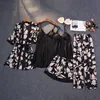 Print Pajamas Set Silky Women 5 Piece Sleepwear Satin Lace Sleep Pyjama Lounge with Belt Chest Pads Sexy Strap Home Nightwear