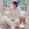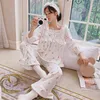 Sweet Lace 2PCS Ladies Pajamas Suit Winter Flannel Warm Nightwear Print Cute Ruffles Home Wear Loose Sleepwear Casual Pyjama