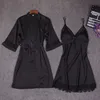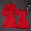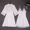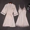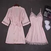 Autumn Women Nightgown Sets 2 Pieces Nightdress Bathrobe with Chest Pad Female Satin Kimono Bath Gown Sleepwear Pink Robes Suit