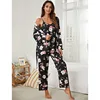 2021 New Women's Pajamas 4 Piece Set Fashion Flower Print Sleepwear Silk Like Leisure Home Clothes Sling Top Shorts Pants Robe