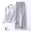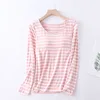 Autumn Modal Pajamas Sets Women Padded Top Long Sleeve O-neck T-Shirt All Match Tee Long Homewear Striped