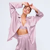Solid Loose Female Pajamas Satin Turndown Collar Long Sleeve Pocket 2 Piece Set Pants Homewear Silk Women Sleepwear Suits