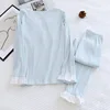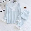 Spring and Summer 100%Cotton Knitted Pajamas Two-piece Ladies V-neck Simple Home Service Set Sweet Long-sleeved Trousers