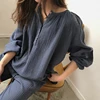 Breathable spring autumn women red blue pajamas set long sleeve sleepwear contton linen loose sweet drawstring pants sets