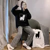 QWEEK Pajamas for Women 2021 Couples Same Style Pijamas Black White Kawaii Cartoon Pyjamas Plaid Bottoms Flannel Sleepwear Cute