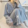 Spring Autumn Women Pajama Sets Long Sleeve Japanese Style Kawaii Notched Collar White Lace Stich Pijama Blue Sleepwear