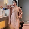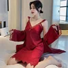 QWEEK Satin Sexy Robe Set Woman 2 Pieces Silk Sleepwear Lace Embroidery Nightgown Kimono Nightie Albornoces Fairy Dresses Gown