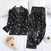 Ice Silk Satin Lapel Women Pajama Set Printing Fashion Pajamas Long Sleeve Pyjamas Set