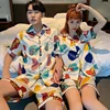 QWEEK Pajama Couple Man and Woman Satin Silk Sleepwear Kawaii Cartoon Pijamas Summer Night Home Suit Pyjamas Suits with Shorts