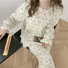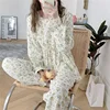 QWEEK Cotton Women's Nightwear Korean Sleepwear Floral Print Pajamas Lace Pijama 2 Piece Set Pyjamas Long Sleeve Suit Homewear