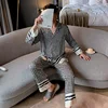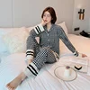QWEEK Houndstooth Nightwear Silk Women's Pajamas Female Set Woman 2 Pieces Autumn Sleepwear Elegant Pijama Pyjamas Loungewear