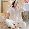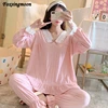 Womens Cotton Pajamas Suit Lace Edge Cute V-neck Cardigan Long Sleeve Sleepwear Underwear Plus Size Home Clothes 2-piece Loungew