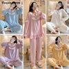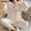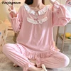 Womens Cotton Pajamas Suit Lace Edge Cute Hedging Long Sleeve Sleepwear Underwear Plus Size Home Clothes 2-piece Lounge