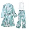 Spring Autumn Women's 3 Pieces Pajamas Sets Silk Nightwear Flower Print Pijama Satin Sleepwear Thin Homewear Nightsuits