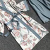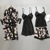 2020 Spring Autumn Women Silk Pajamas Sets With Chest Pads Flower Print Pijama Sleepwear 4 Pieces Spaghetti Strap Satin Pyjamas
